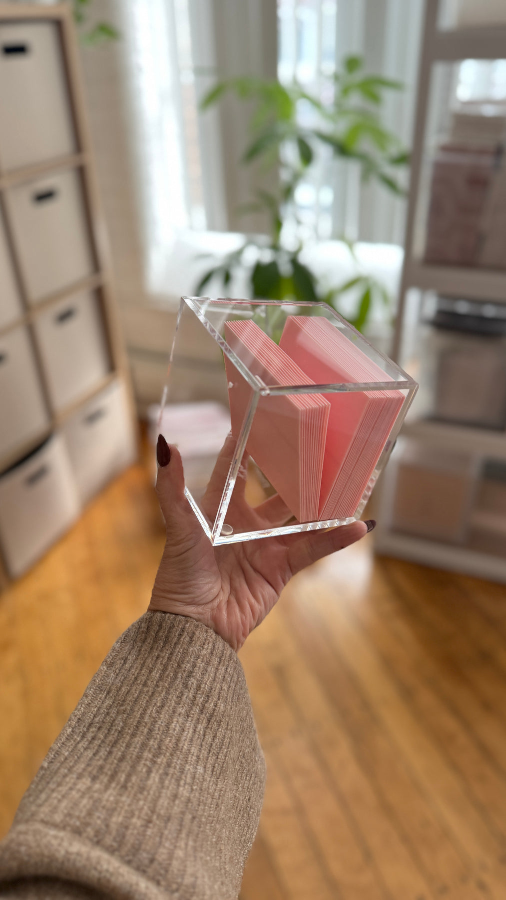 I designed this beautiful 4x4 acrylic box to perfectly fit the 52-week saving challenge envelopes—just like our acrylic tray, but in a sleek, compact size! ✨ The box features a logo on the bottom, rubber feet for stability, and comes with 52 envelopes, each with a sticker attached.
